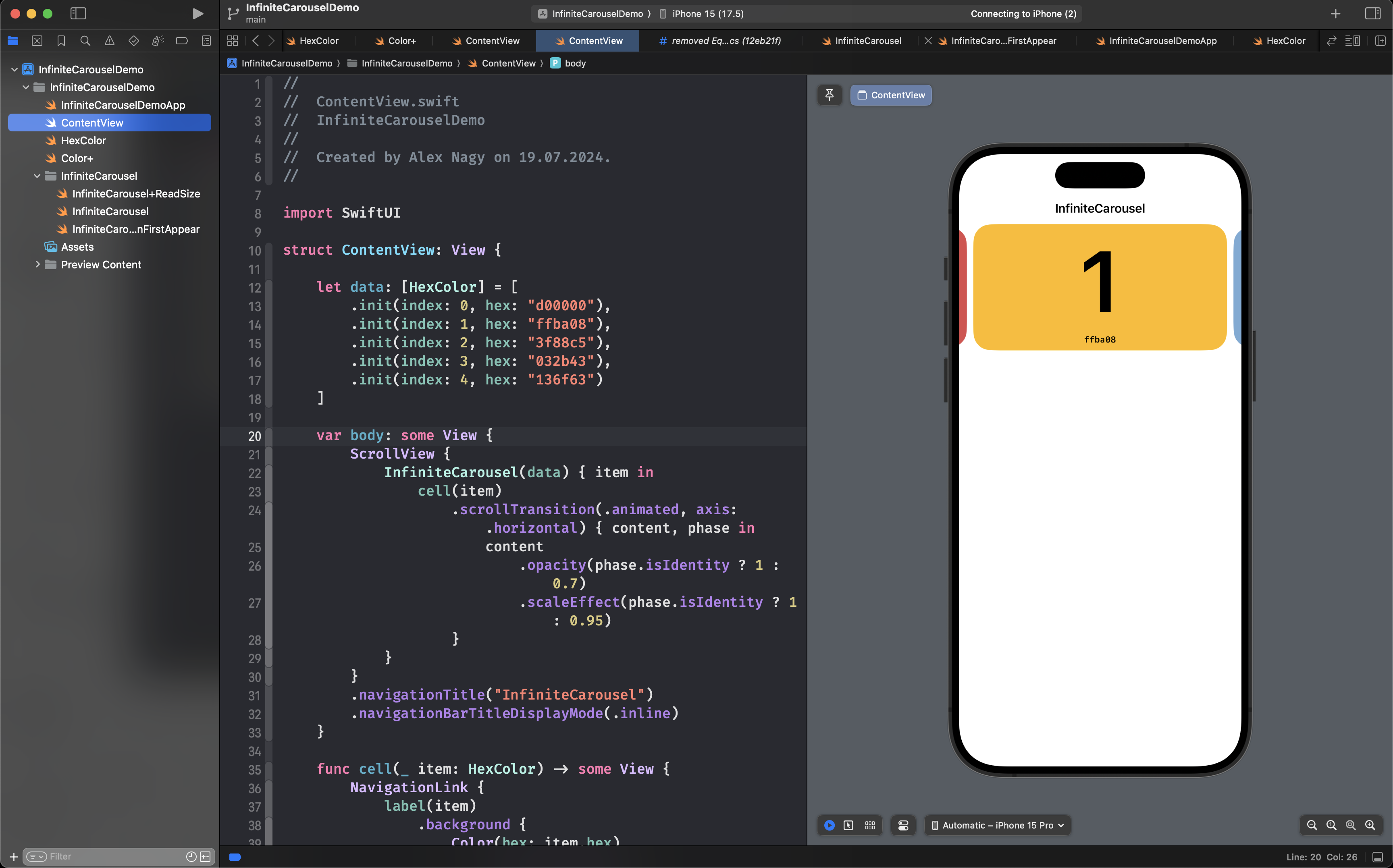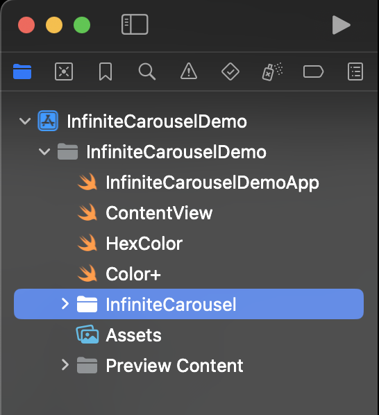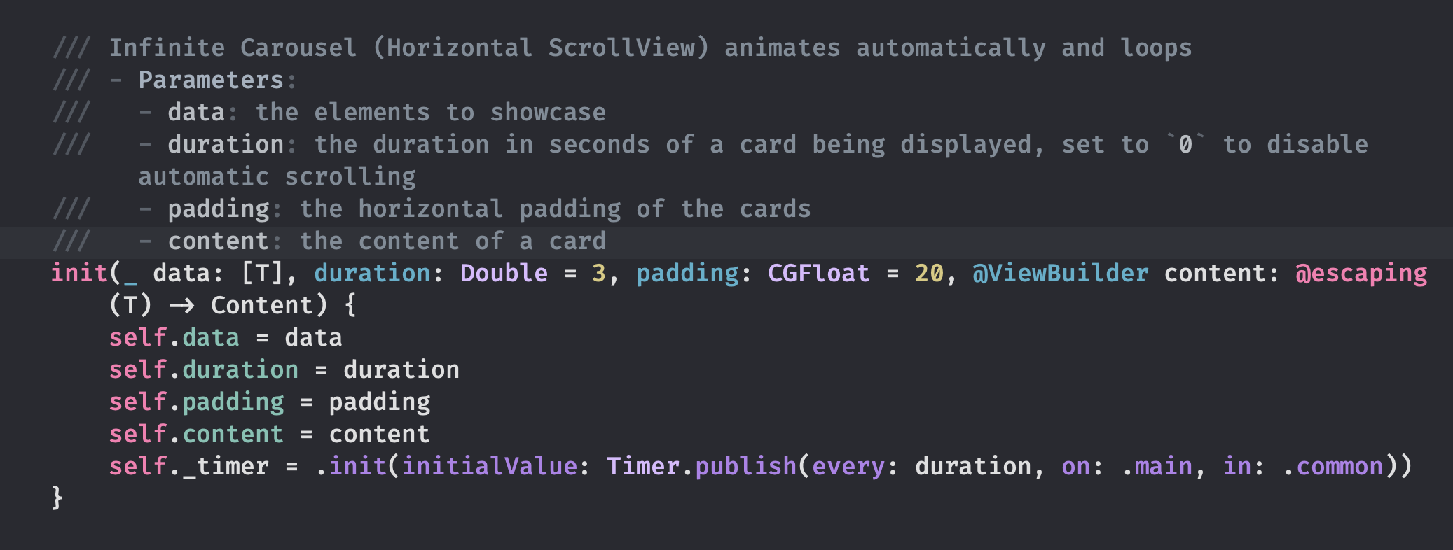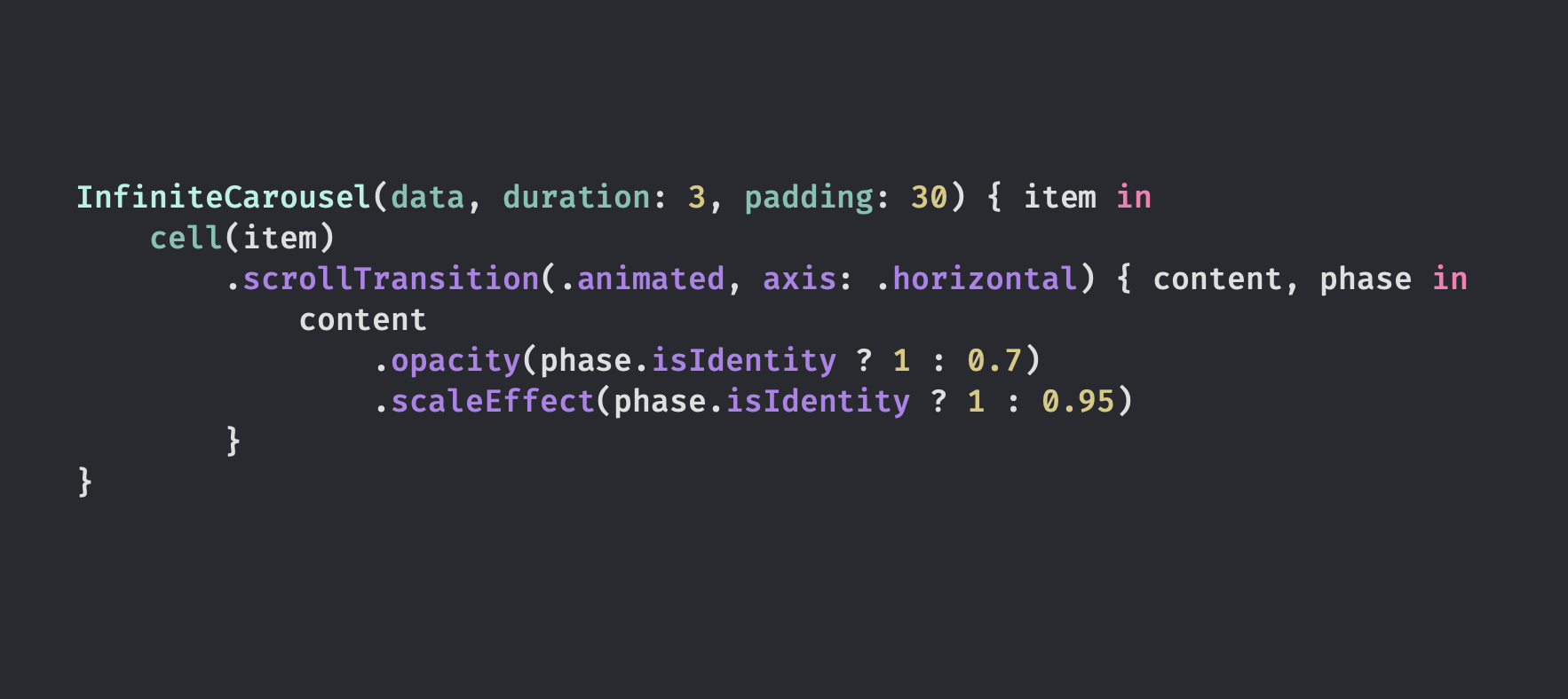 Use InfiniteCarousel by providing an array of Equatable data, setting the duration to display each card (set to 3 seconds by default) and the padding (set to 0 by default).