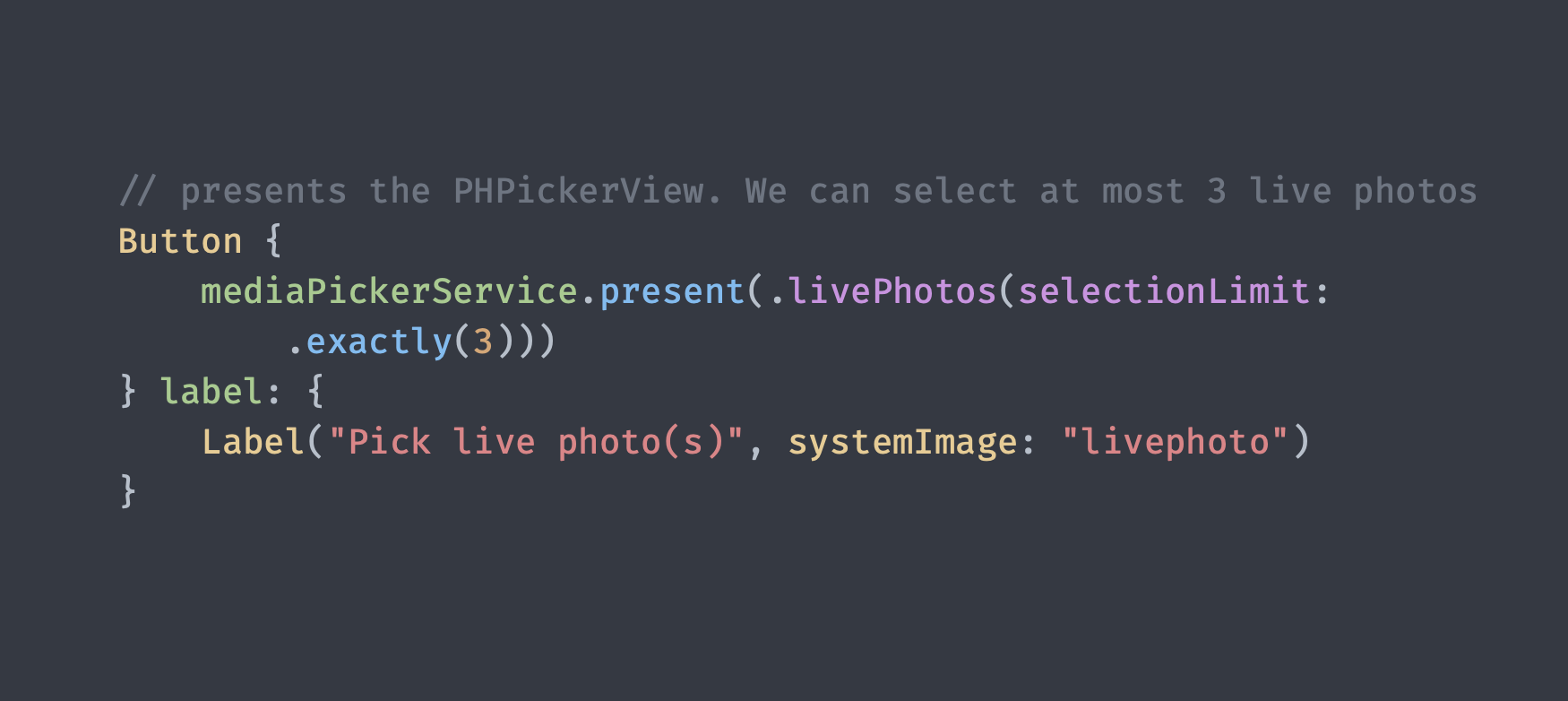 Use the results. Access a universal mediaPickerResult or any of the images / videoUrls / livePhotos / pdfDocuments@Published variables from mediaPickerService.