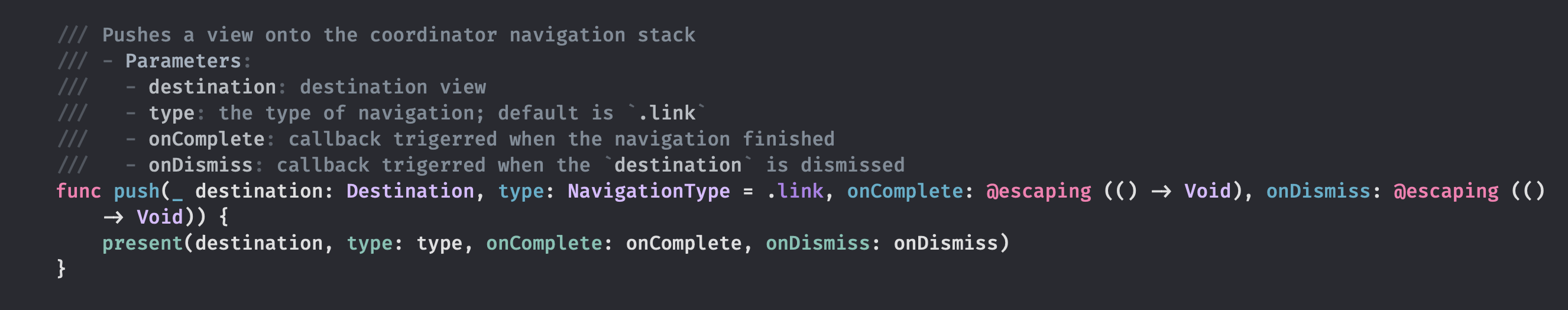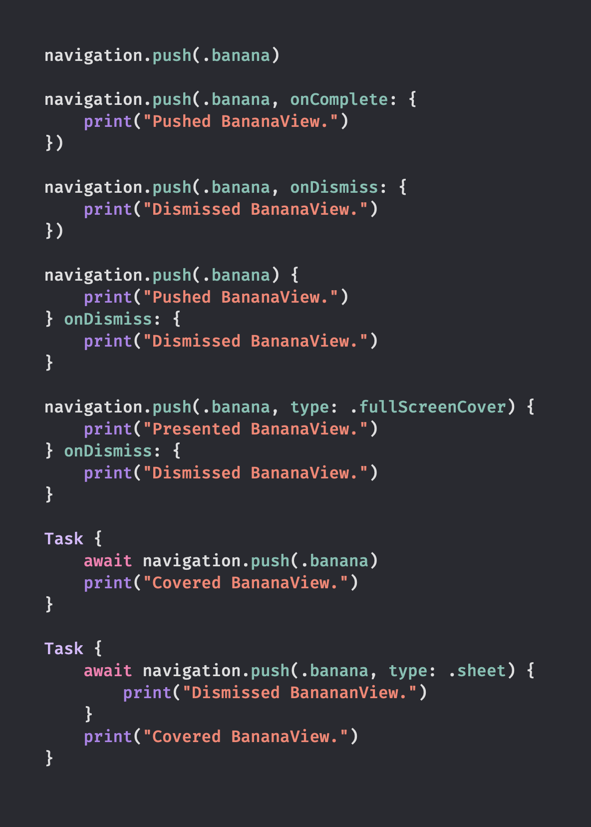 Push a view. Optionally add onComplete and/or onDismiss callbacks. Select the push type. Use in an async/await environment.